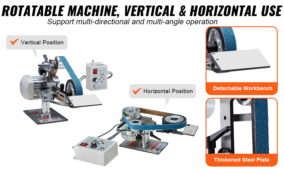 • Support Vertical & Horizontal Use: Designed for both vertical and horizontal operation, this belt sander abrasive machine accommodates various angles with ease. Its reinforced steel frame ensures durability for consistent performance, while the detachable workbench enables optimal positioning for any task.