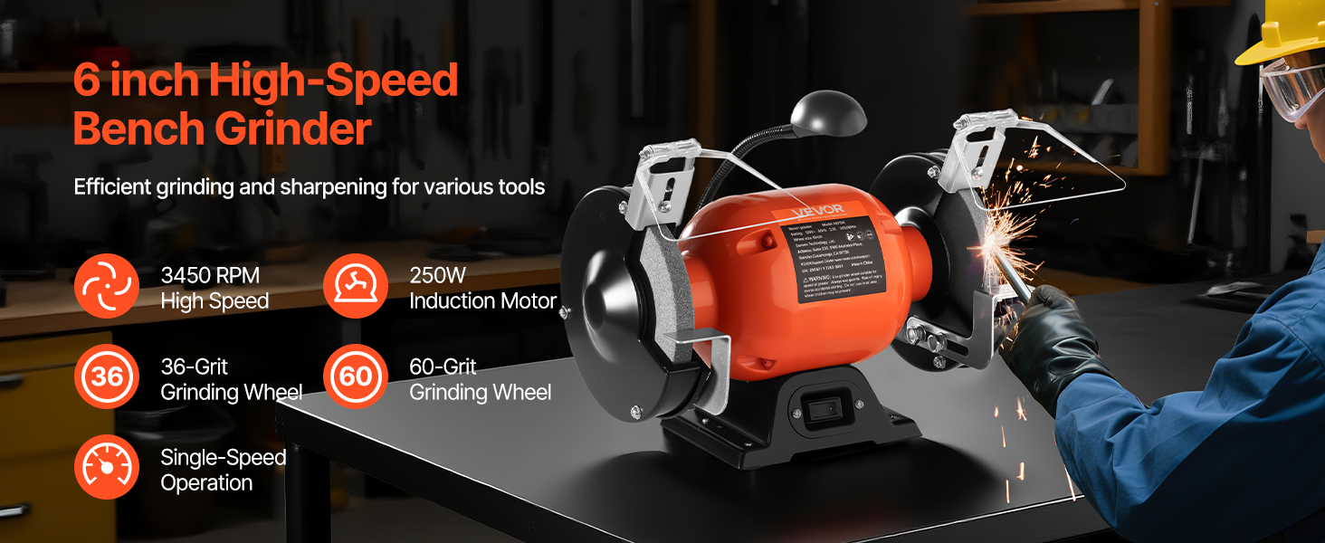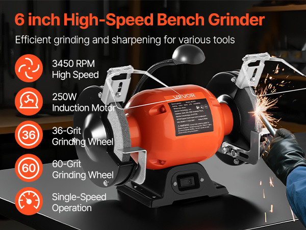 This 6-inch single speed bench grinder features a 250W 2.1A induction motor with 3450RPM high speed. Comes with 36/60-grit grinding wheels for both coarse and fine grinding. Its adjustable eye shields, work rests, LED work light, and anti-vibration body ensure stable and efficient grinding.