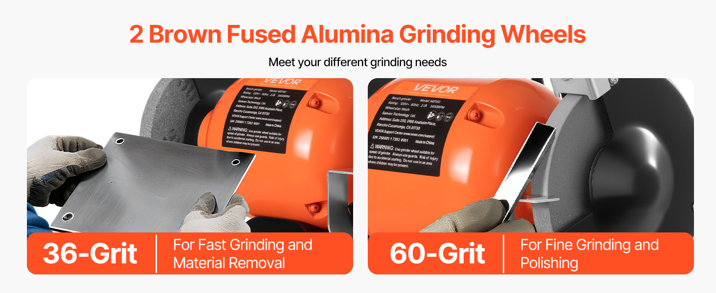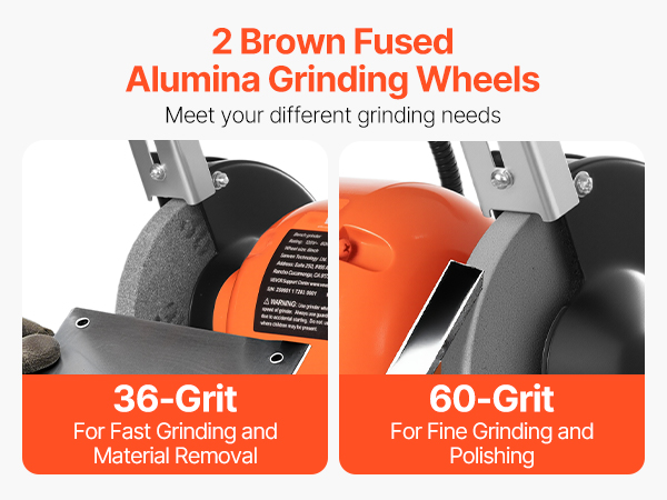 - Efficient Grinding Wheels: Our single-speed table grinder includes 2 durable brown fused alumina wheels: the 36-grit wheel for fast material removal and the 60-grit wheel for fine, precision grinding. Ideal for sharpening knives, blades, chisels, axes, and more — ideal for DIYers and mechanics.