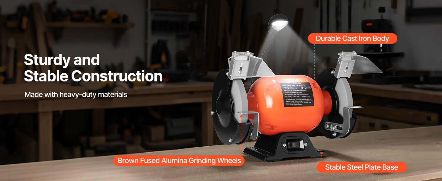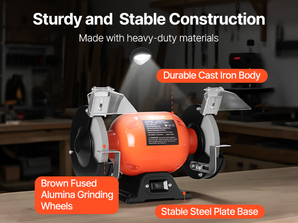 Our table grinder is built with a durable cast iron body, steel plate base, and brown fused alumina wheels for long-lasting use. The heavy-duty frame reduces vibration, and anti-slip rubber pads further enhance stability.