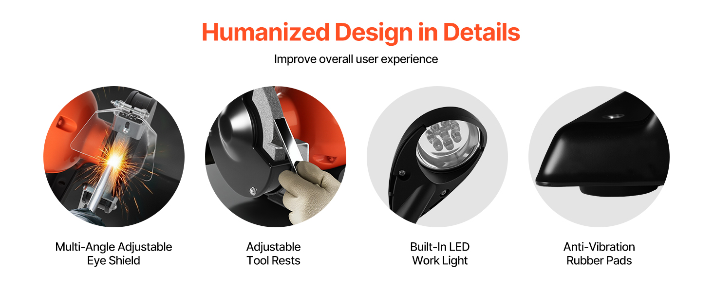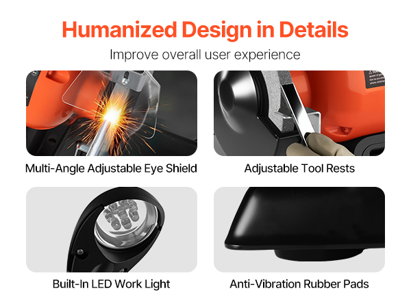 - Thoughtful Designs: Our bench grinder features a built-in LED work light to illuminate the work area for more precise grinding. The tool rest can be adjusted without tools, allowing flexible angles for smoother, more accurate results.