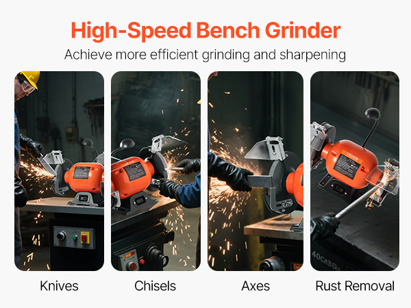 Our benchtop grinder offers powerful grinding at 3450RPM high speed, ideal for sharpening knives, chisels, and axes, as well as deburring metal parts and removing rust with efficiency and control.
