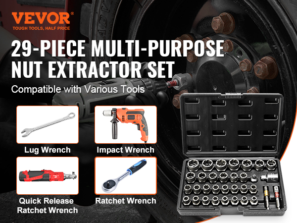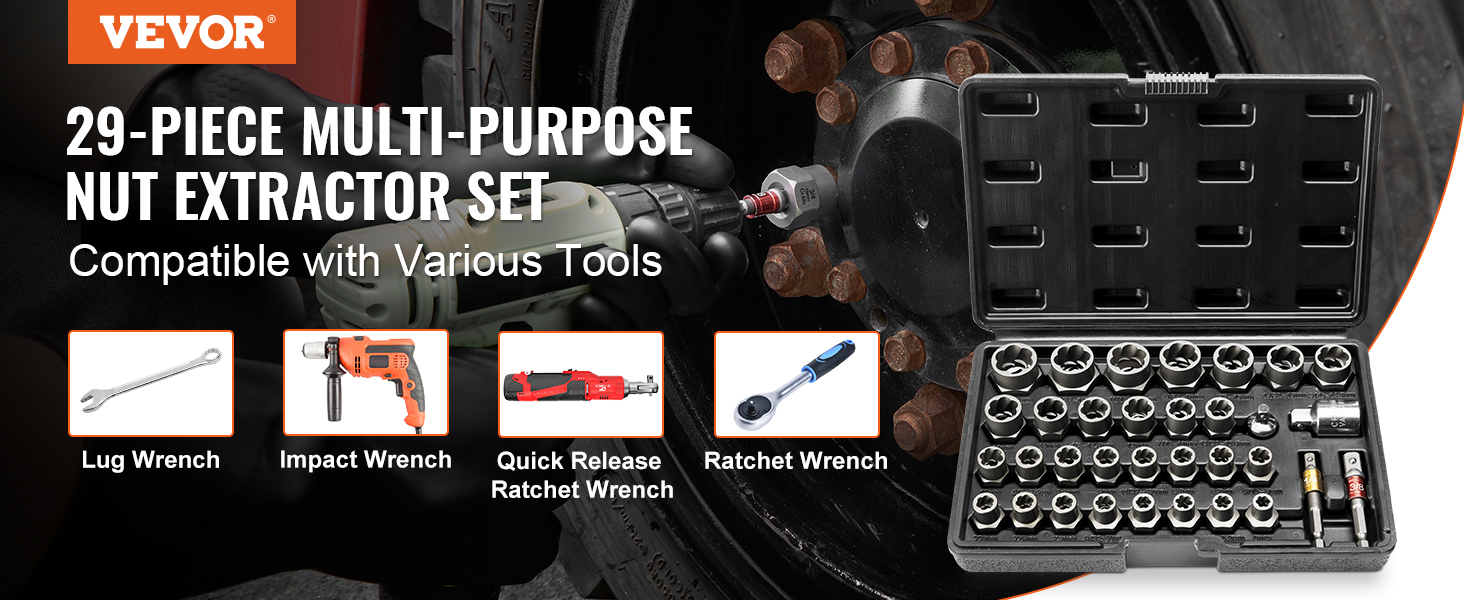 Our 29-piece multi-functional bolt extractor set is perfect for home renovations, auto repairs, and DIY projects. It allows you to effortlessly remove stuck or rusty nuts and bolts. Crafted from high-hardness steel, it offers a strong grip without breaking or deforming.