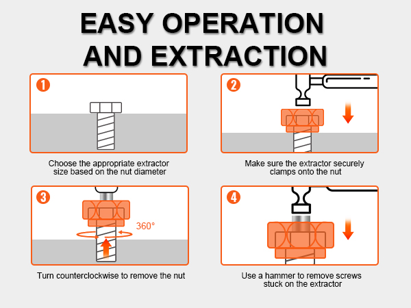 You can use our bolt extractor kit with an adjustable wrench or power tools for disassembly. When striking or screwing nuts, tiny metal fragments may scatter, so we recommend wearing safety goggles and gloves for secure operation.