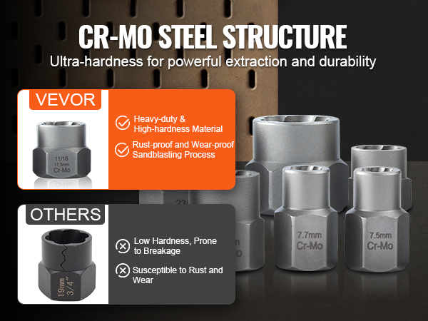 The bolt extractors come in various sizes and are made of high-quality, high-hardness chromium-molybdenum steel (Cr-Mo). They provide exceptional durability and resistance to breakage, even under heavy force.