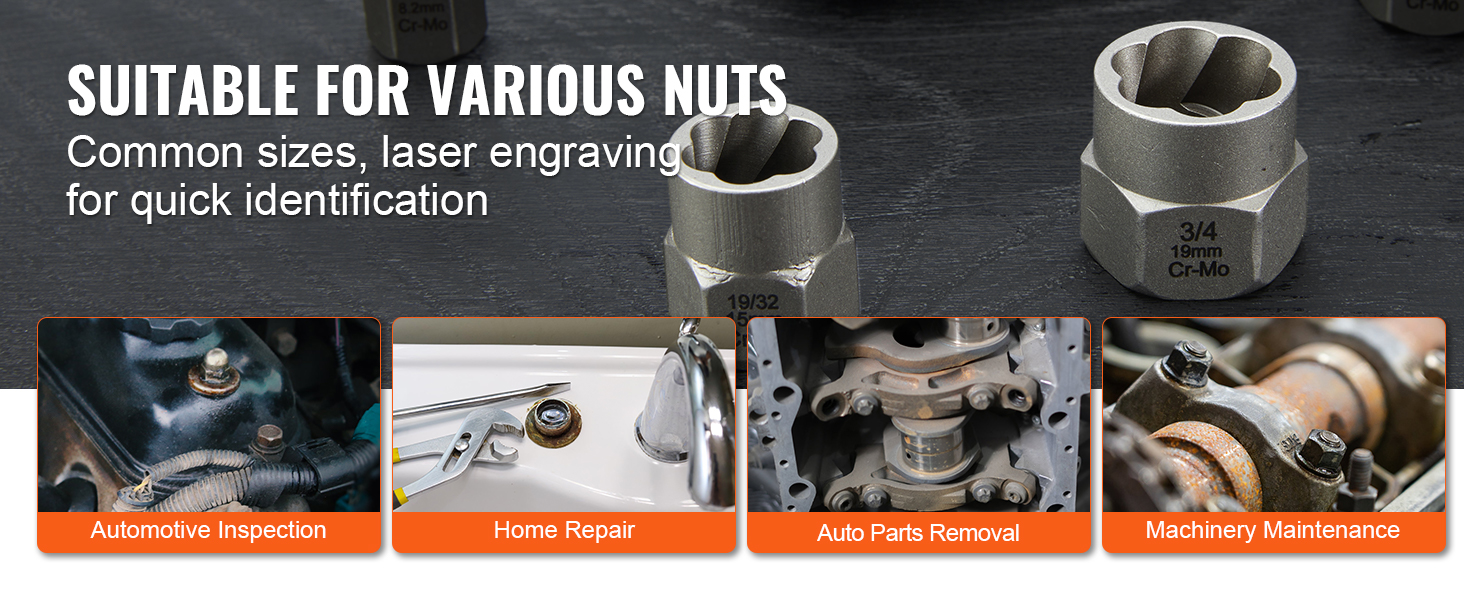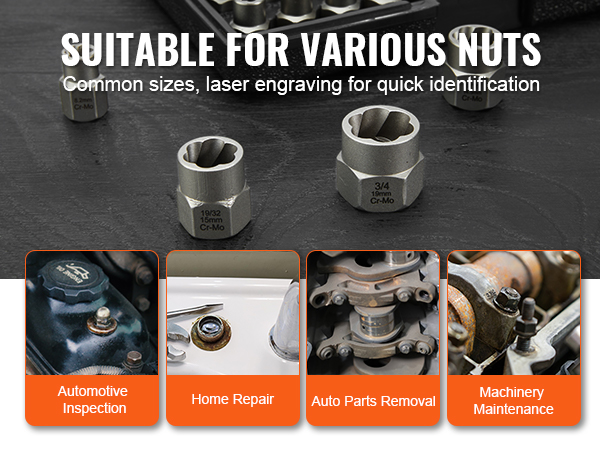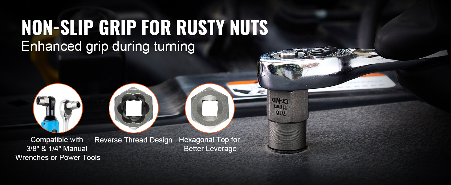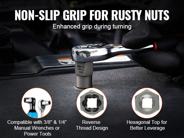 Our stripped bolt remover is compatible with 3/8″ and 1/4″ manual or power tools, such as adjustable wrenches, ratchets, and electric wrenches. The reverse thread design ensures secure removal of rusty or tight nuts, reducing slippage.