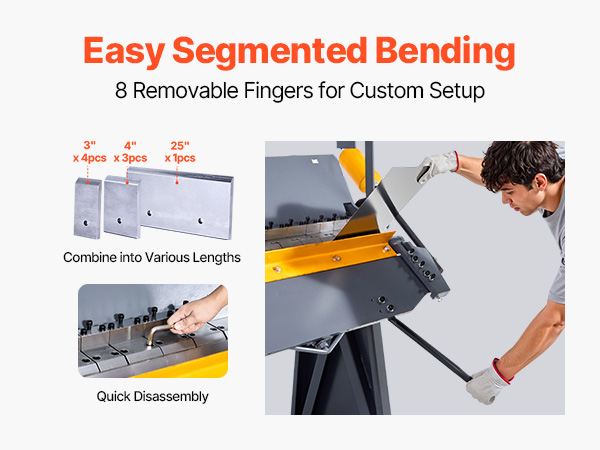 - Customizable Die Setup: This sheet metal bender includes 8 segmented fingers (3″ x 4 pcs, 4″ x 3 pcs, 25″ x 1 pc) that can be freely arranged for precise, segmented bends. Perfect for fabricating electrical enclosures, casings, HVAC components, and complex flanged panels.