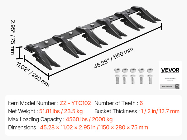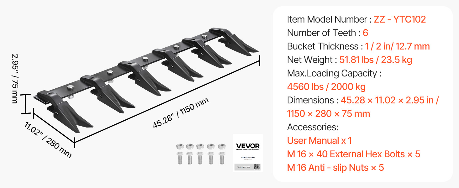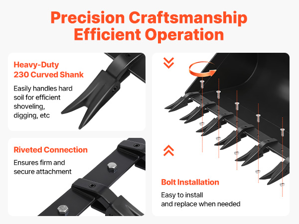 - 230 Curved Tooth Bar: Unlike most straight bucket teeth, our curved bucket tooth bar is engineered for excavator buckets to deliver exceptional efficiency. With 4560 lb load capacity, it handles tough soil conditions, for high-intensity digging tasks