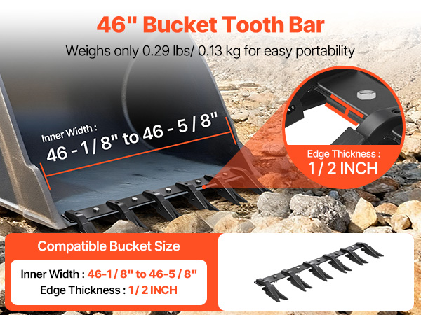 - Easy Installation: This loader bucket tooth bar fits buckets with an inner width of 46-1/8" to 46-5/8" and a 1/2" edge thickness. The rivet-and-reinforced-bolt design ensures quick, secure installation. The bolt-clamp structure keeps the tooth bar firmly
