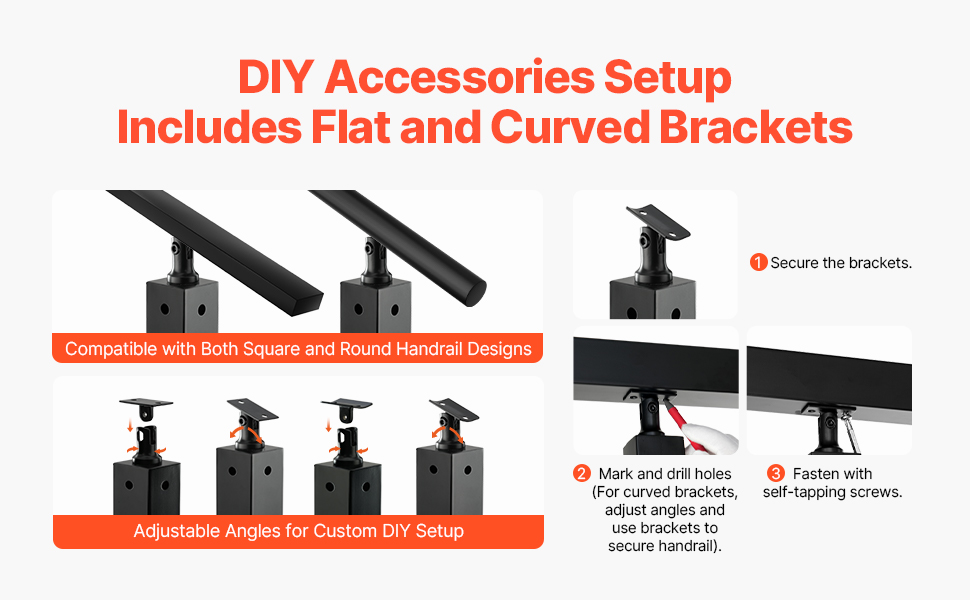 - Easy Installation and DIY: This deck railing post includes horizontal and curved supports, suitable for various hole types in railing posts. It is compatible with square and round pipe handrails, allowing for DIY customization of handrail angles.