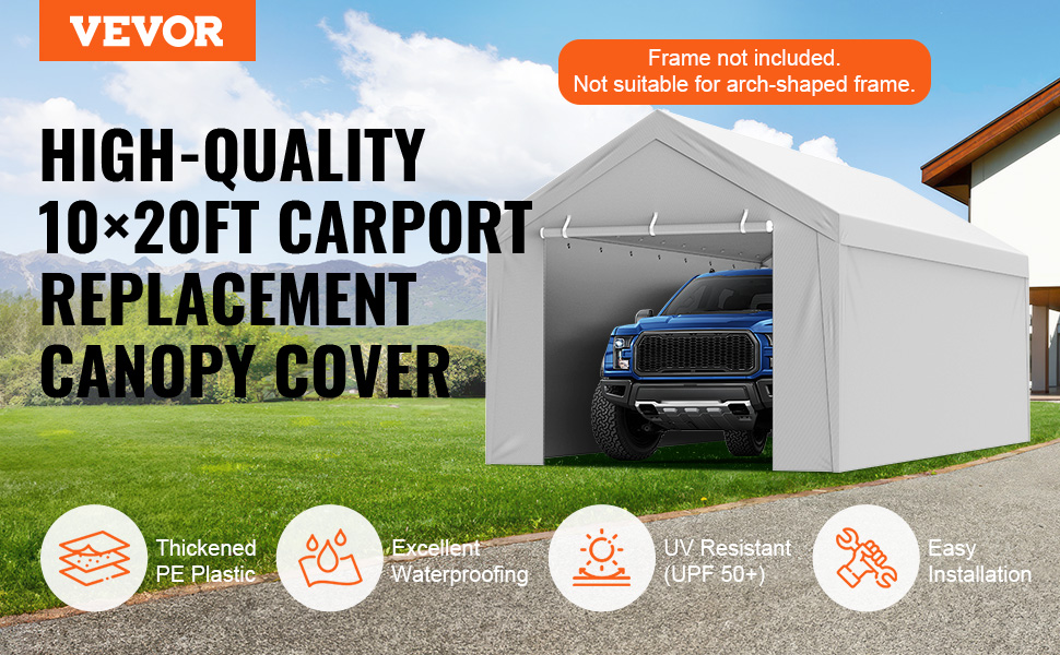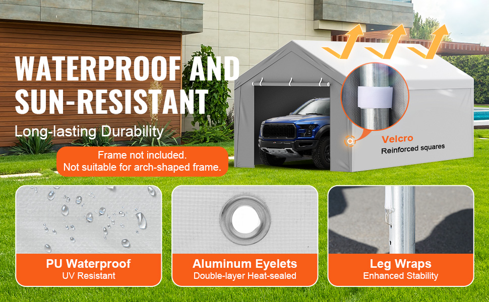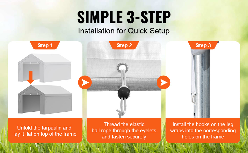 - Easy Installation: Comes with elastic ball bungees for fastening through aluminum grommets, and Velcro for side attachment, making installation simple and tool-free. Note: The carport cover is not suitable for arch-shaped frame.