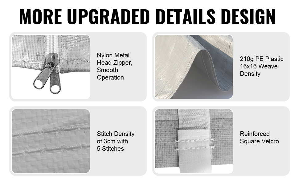 - Durable Material: The top canopy fabric is 210g PE plastic woven, while the side panels are 180g PE plastic. Both are crafted with a 16×16 weave pattern for thickness and resistance to water pooling. Double-layer heat-sealed seams and reinforced Velcro attachments ensure durability and longevity.