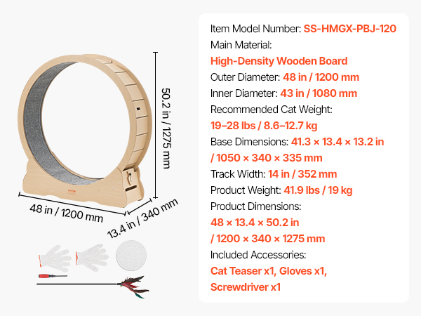 - Spacious for Medium to Large Cats: Measuring 48 in/1200 mm outer diameter and 43 in /1080 mm inner diameter, this cat exercise wheel supports cats up to 28 lbs. With 14 in wide track, it provides ample space for medium to large cats. It helps increase exercise, burn energy, or aid in weight loss for overweight cats to maintain health