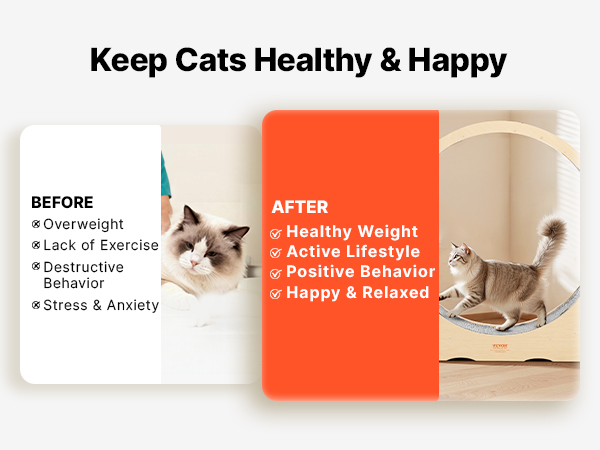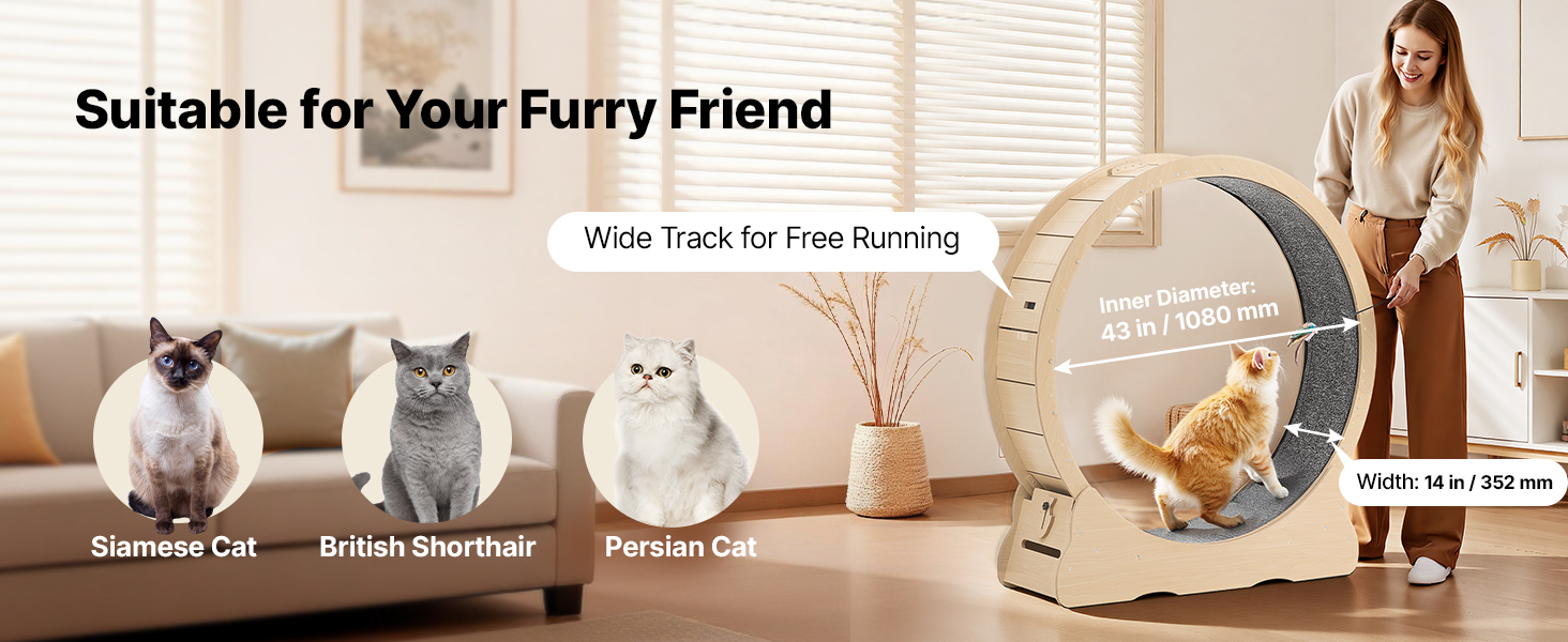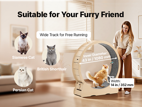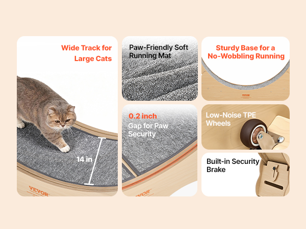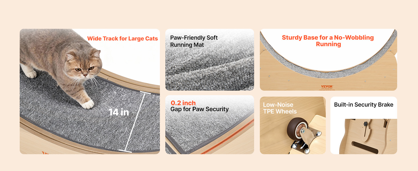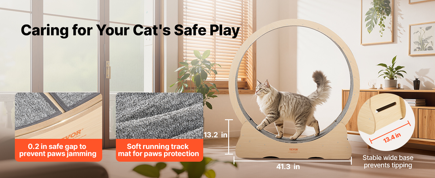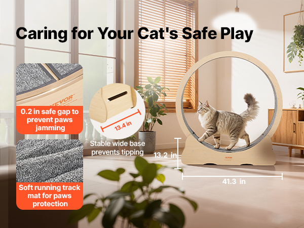 - Cat Security Comes First: Designed for medium to large cats, this exercise wheel ensures no strain on your cat’s spine. The wide base provides extra stability, preventing tipping during vigorous exercise. The 0.2 in security gap prevents paw injuries, and the soft track mat reduces friction, protecting your cat’s paws during extended play