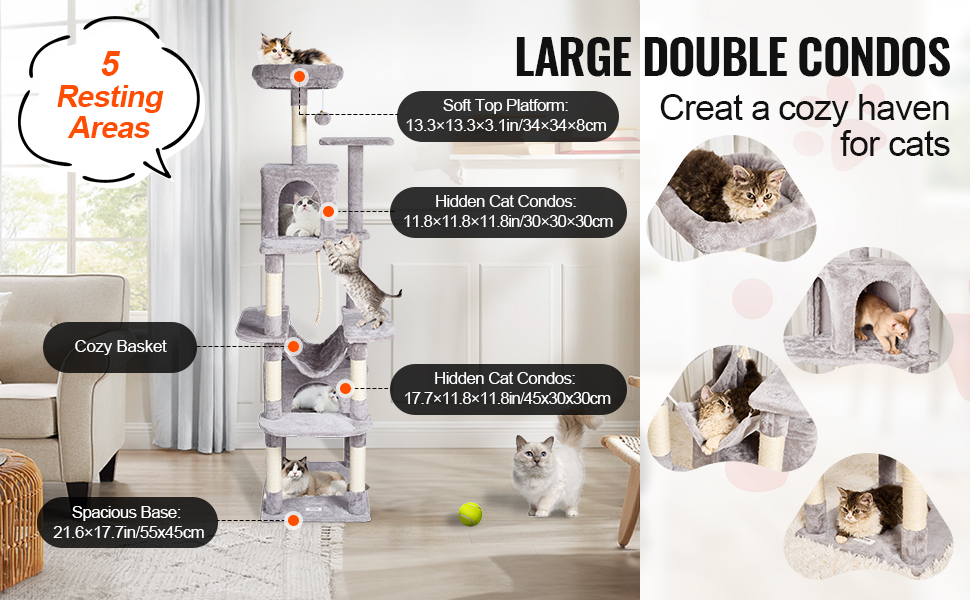 Let cats enjoy a comfortable and secure environment on this cat tower. With different resting areas including a spacious base, cozy hammock, 2 hidden cat condos, and soft top perch for cats to lounge, hide, or perch high.