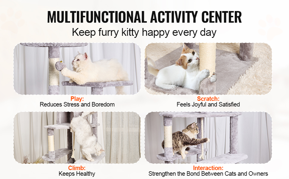 This thing is awesome! Other than FedX delivering to the wrong address, the cat tree was received well packaged. It went together really easily and only took about twenty minutes. The cat is already checking it out and using the scratch polls. Another great product from Vevor.