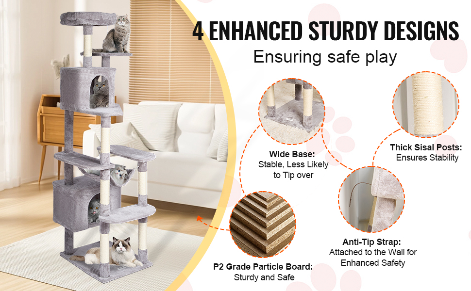 Safety is our priority. This cat scratching tree is made from P2-grade particle board, ensuring durability without odor. The large base and reinforced sisal posts further enhance stability. Anti-tip straps can be mounted to the wall for extra security.