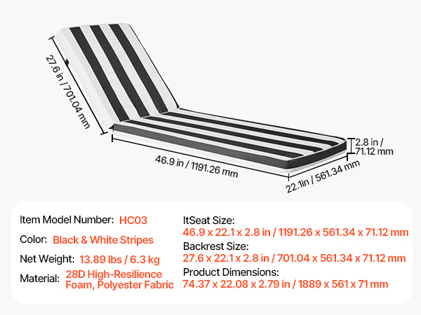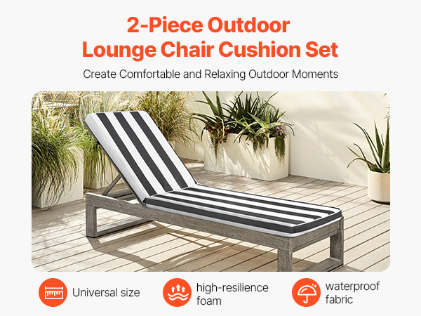• Universal Fit: This set of 2 outdoor lounge cushions features a seat size of 47 x 22 x 2.8 in / 1191.2 x 561.3 x 71.1 mm and a backrest size of 27.6 x 22.1 x 2.8 in / 701.04 x 561.34 x 71.12 mm, designed to fit most standard lounge chairs. It offers full-body support and lasting comfort. For optimal fit, please measure your chair before purchase.