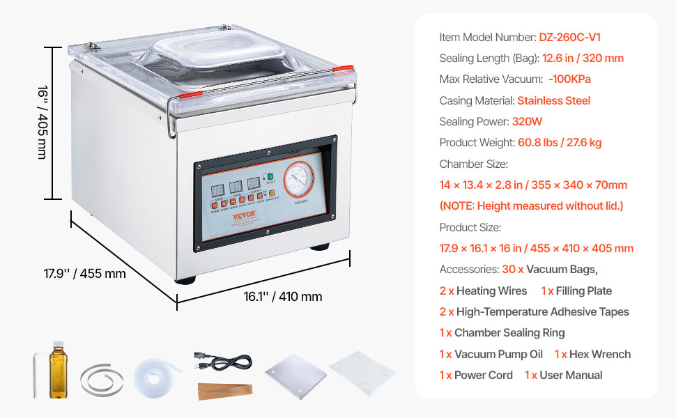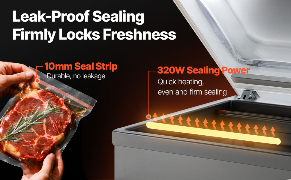- Dual Lock Seal: The 10 mm wide seal strip and 320W heater of the chamber sealer create a strong, seamless seal that withstands freezer swelling and bumps. You can pack food at home or for business with no leaks and less waste.