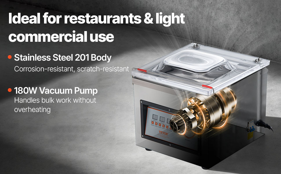 Crafted with 201 stainless steel and a 180W vacuum pump, this chamber sealer delivers stable performance for continuous use. Its tough build ensures long-term reliability.