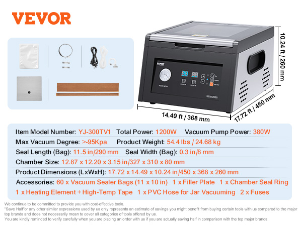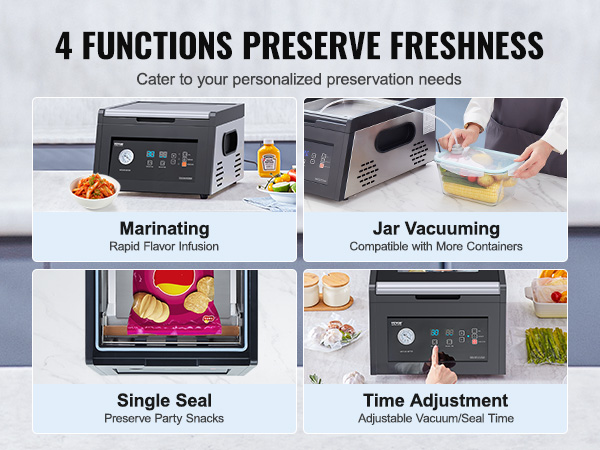 - All-in-One Sealer: This vacuum chamber sealer comes with multiple practical features to streamline your food preservation. Adjustable vacuum/seal time caters to different ingredients, while marinating, single seal, and jar vacuuming meet diverse needs
