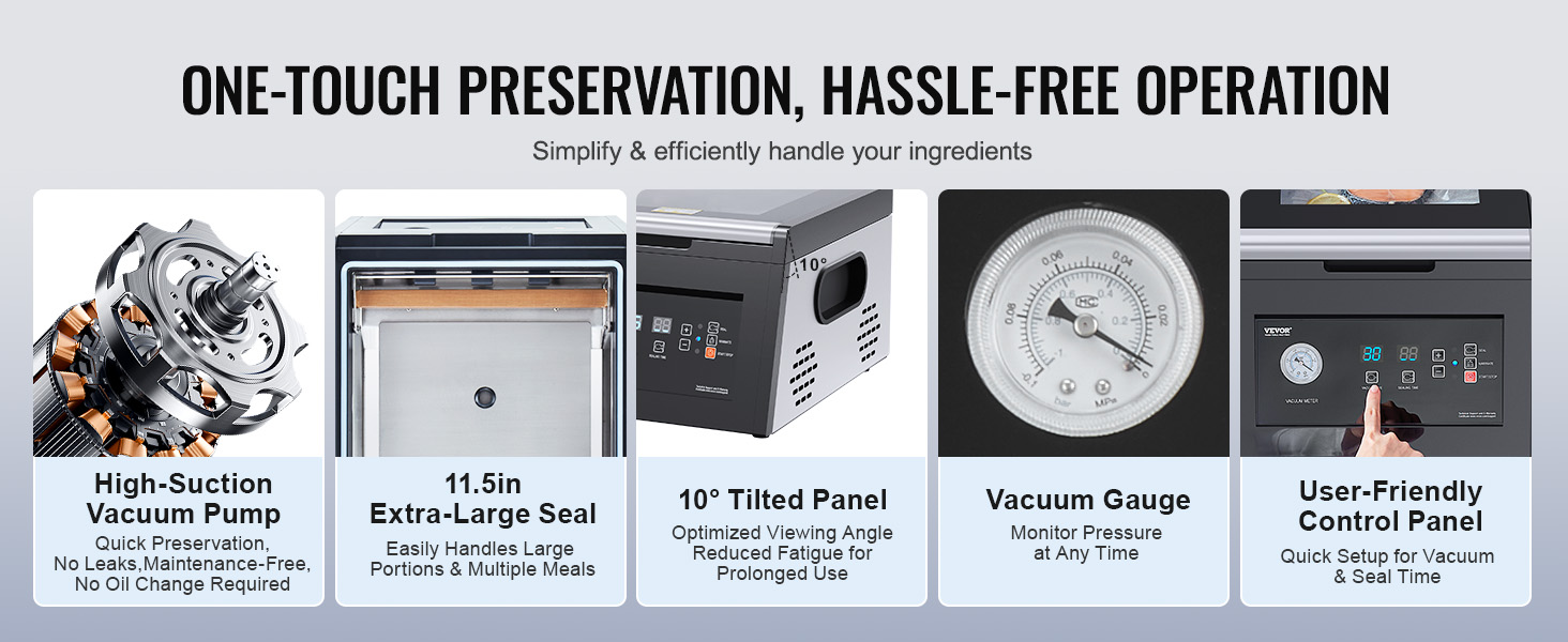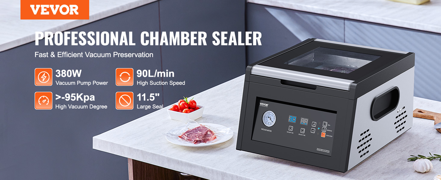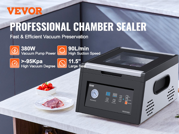 - Better Preservation: Our chamber vacuum sealer packs a punch with a 380W vacuum pump. It sucks out air at 90 L/min, reaching a vacuum degree of over -95 kPa. Your ingredients stay juicy, flavorful & fresh for up to 5 times longer! No oil changes needed