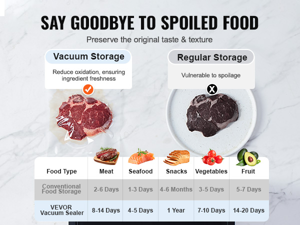 Our chamber sealer’s super vacuum power (-95 kPa+) keeps food fresher for 3-5 times longer. Seal and refrigerate to avoid fridge smells, ensuring every bite tastes just like the first.