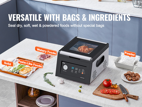 - Modern Kitchen Essential: This sleek chamber sealer is a great fit for modern kitchens. The 304 stainless steel chamber keeps it food-safe and easy to clean, ensuring durability and a safe environment. The full-glass lid lets you watch the magic happen