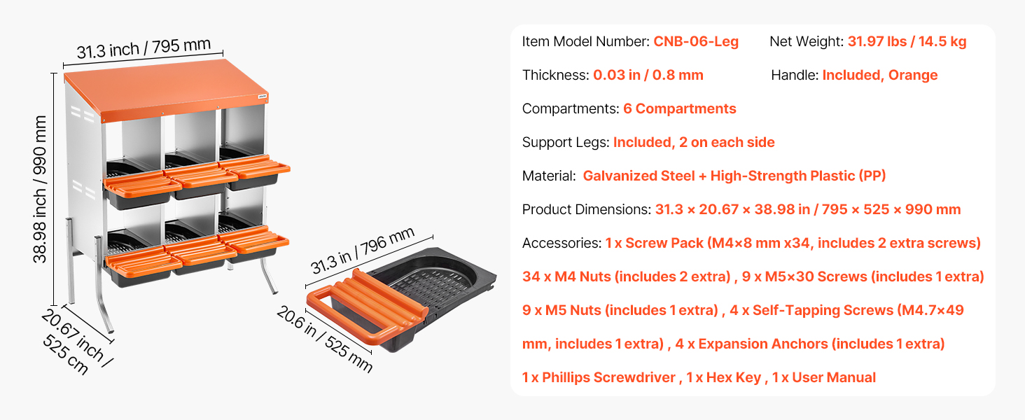 Easy to assemble, more than sturdy enough for my heavy chickens . I have yet to get a soiled egg. The chickens adapted to this nest box at day one. I’m very happy to have purchased this nest box.