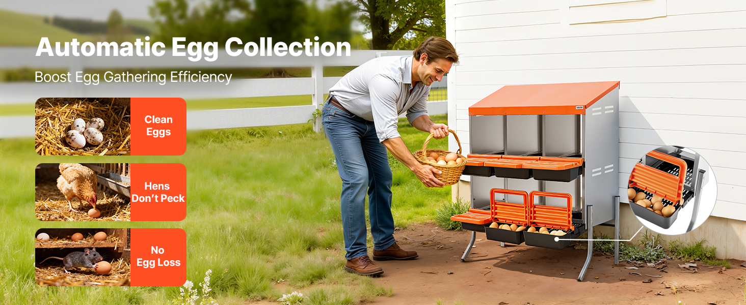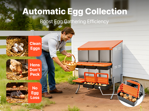 - Egg Collection Made Easy: Angled nesting trays in the chicken laying boxes guide eggs into the collection area, minimizing breakage. Eggs are retrieved by opening the handle, reducing labor and enhancing collection efficiency while maintaining egg cleanliness.
