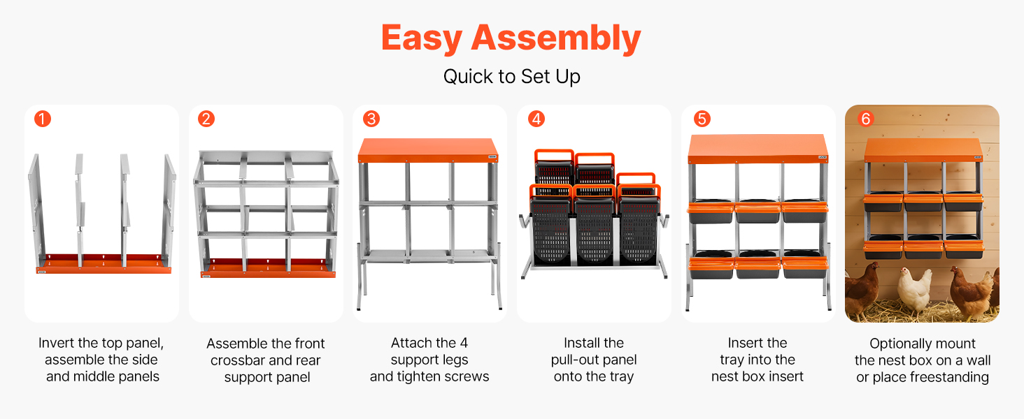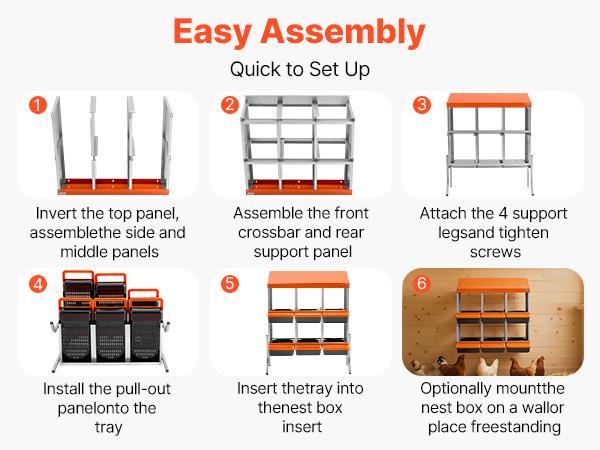 The hen laying boxes are quick and easy to install. A user manual and all necessary accessories are included. Simply follow the guide for a fast and straightforward setup.