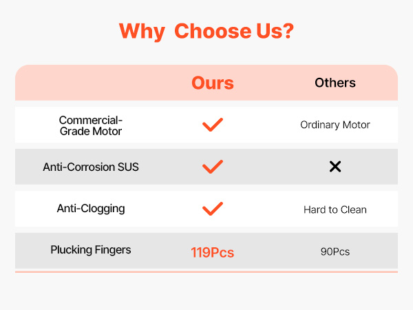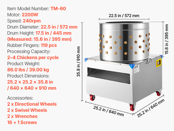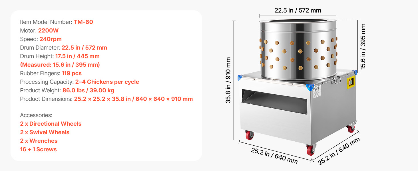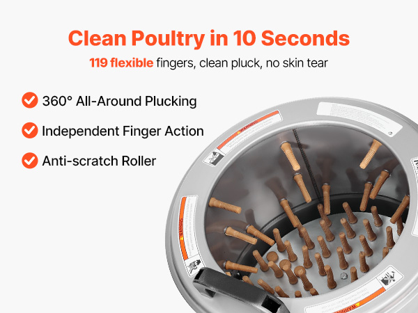 - Professional-Grade Performance: Our chicken plucking machines comes with 22.5-inch (572mm) stainless steel drum and 119 rubber plucking fingers that gently remove feathers from chickens, ducks, and turkeys. Advanced temperature control adapts to fine or coarse feathers, minimizing meat damage