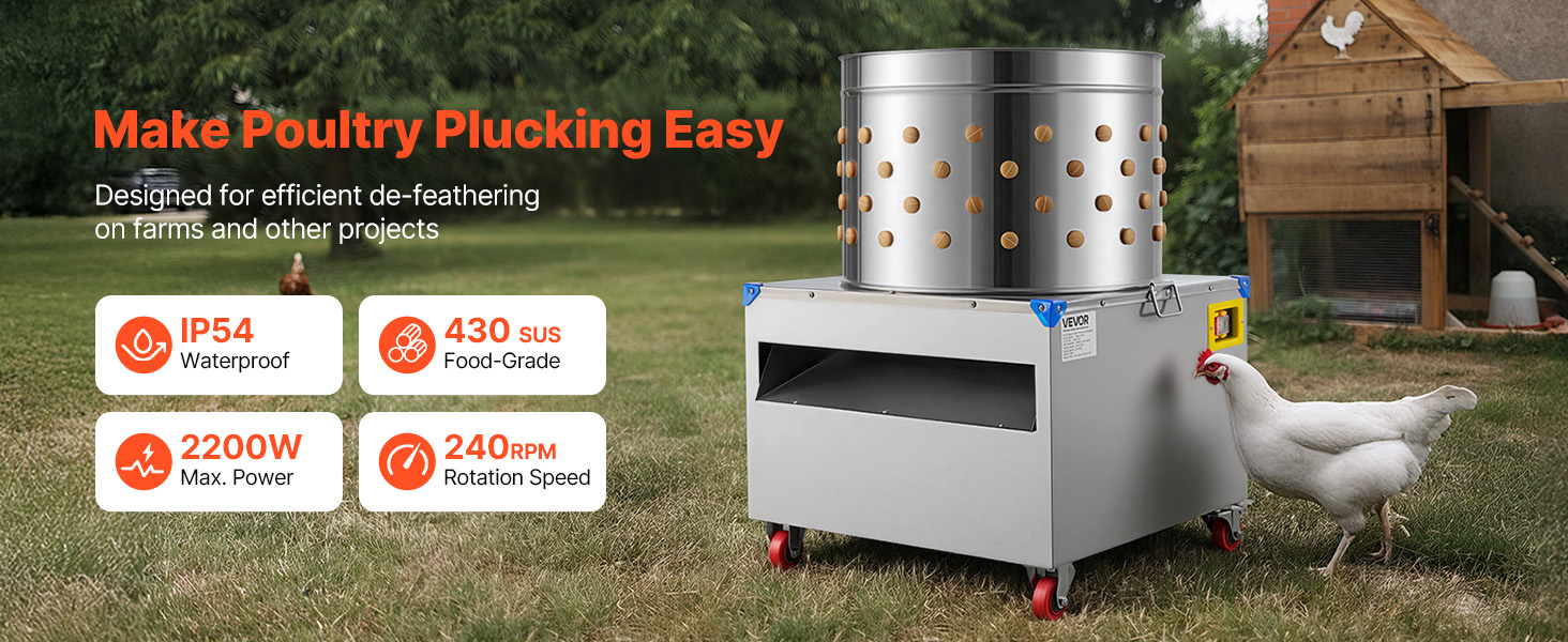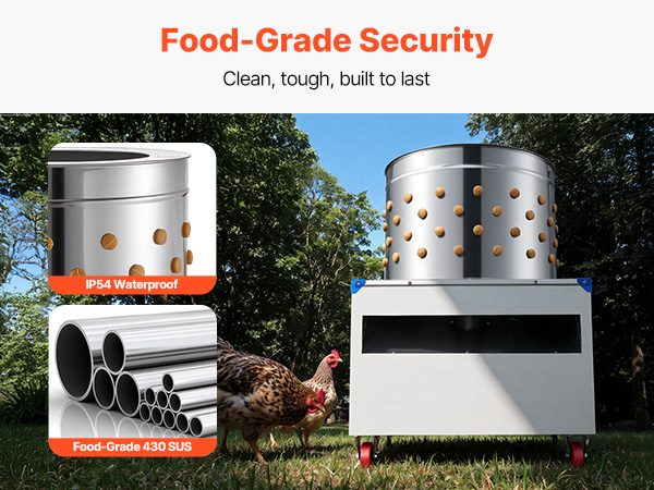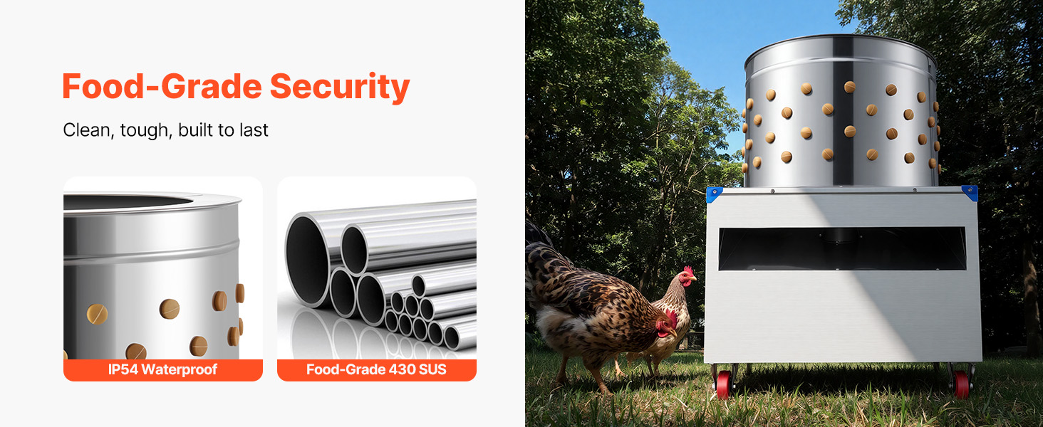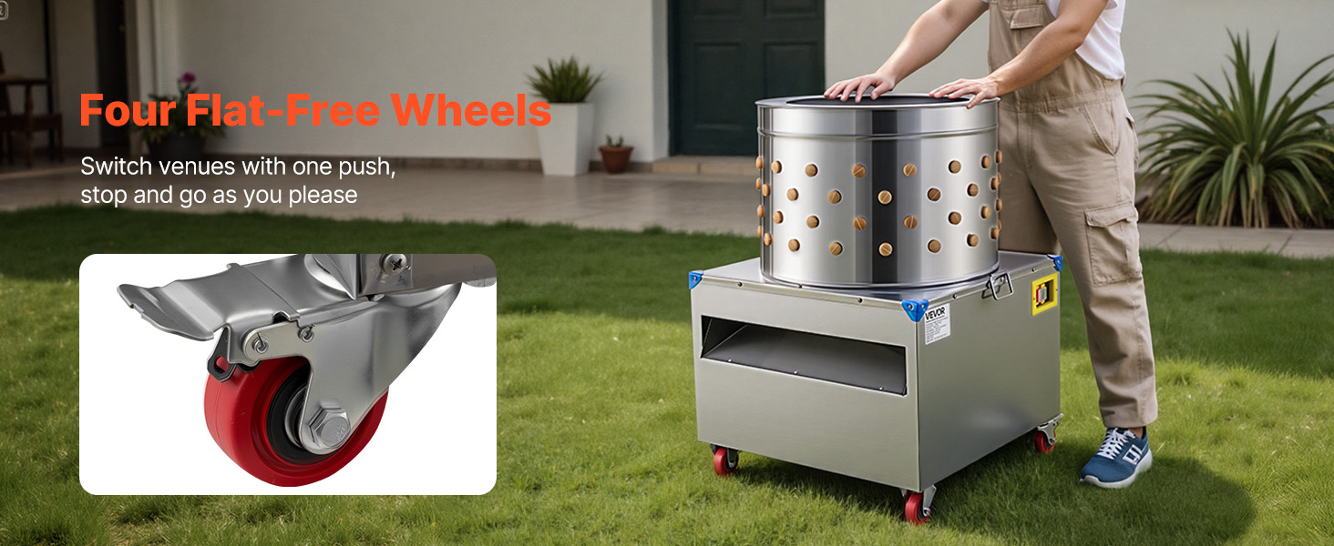 - Premium Build for Durability: Built with an IP54-rated waterproof exterior and 430 stainless steel material, with a corrosion-resistant 0.03-inch (0.7mm) thick barrel. Our poultry plucker features reinforced legs and 2 fixed and 2 swivel wheels ensure stable mobility on uneven farm surfaces