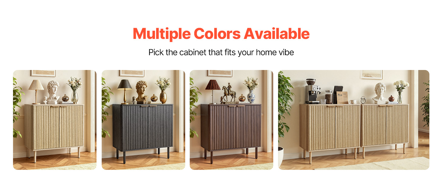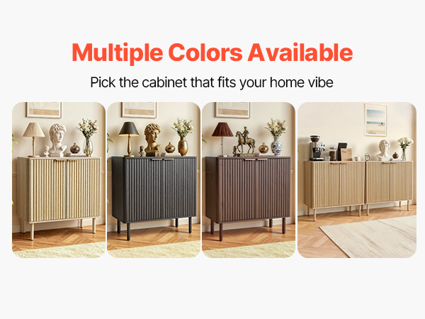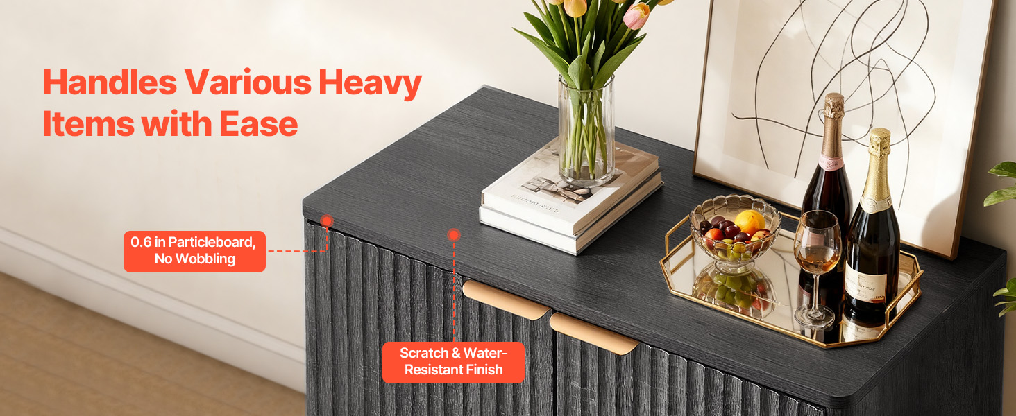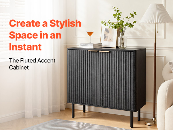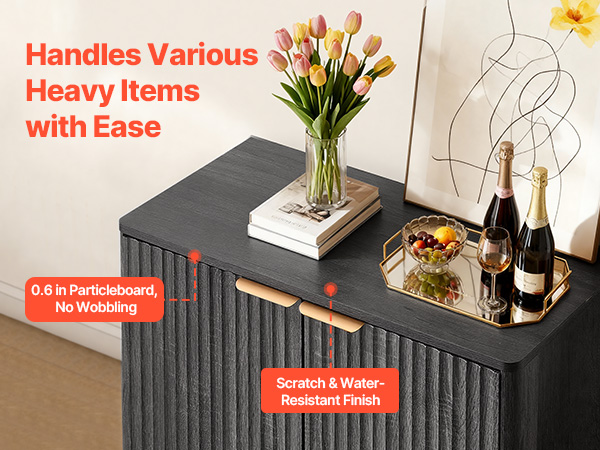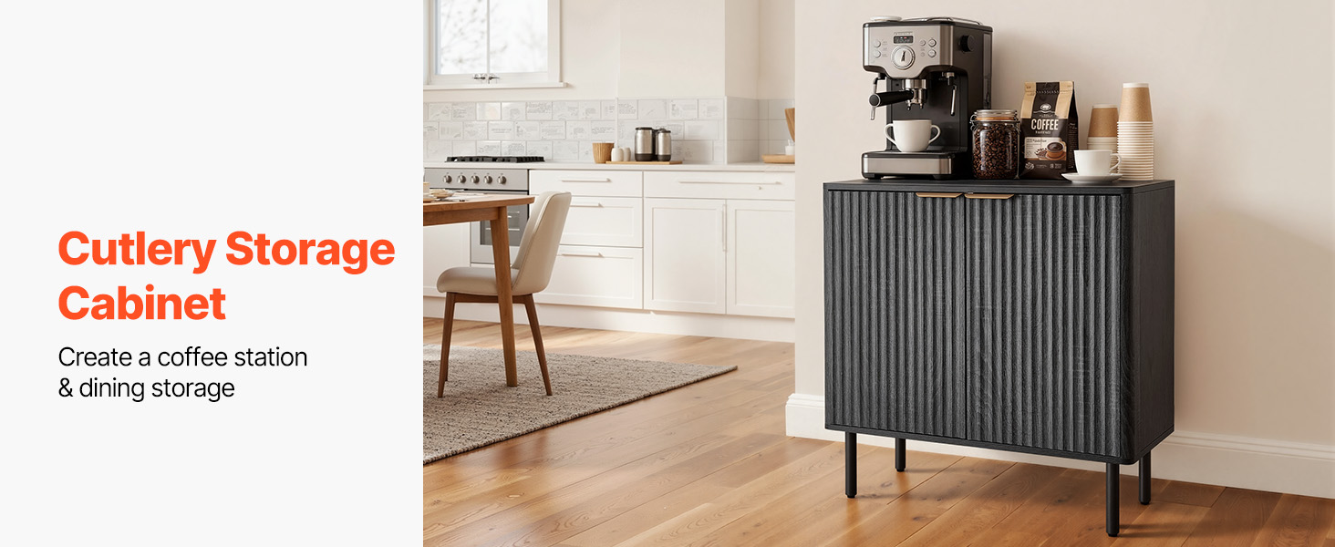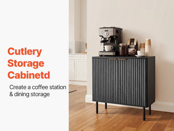 - Elegant Fluted Design: This coffee bar cabinet features vertical fluted panels and a sleek curved silhouette that add elegance to your home. The natural wood finish and metal handles blend modern and mid-century styles, making it both a stylish accent cabinet.
