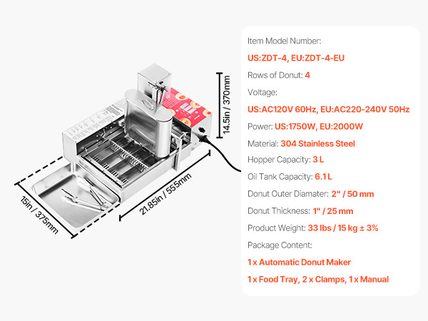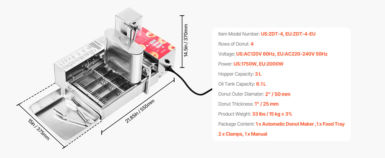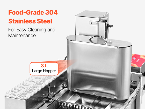 - Food-Grade Stainless Steel: Constructed with 304 stainless steel, this frying donut maker is easy to clean and maintain. Featuring a 3L hopper and a 6.1L oil tank, it’s designed for high-volume production without constant refilling.