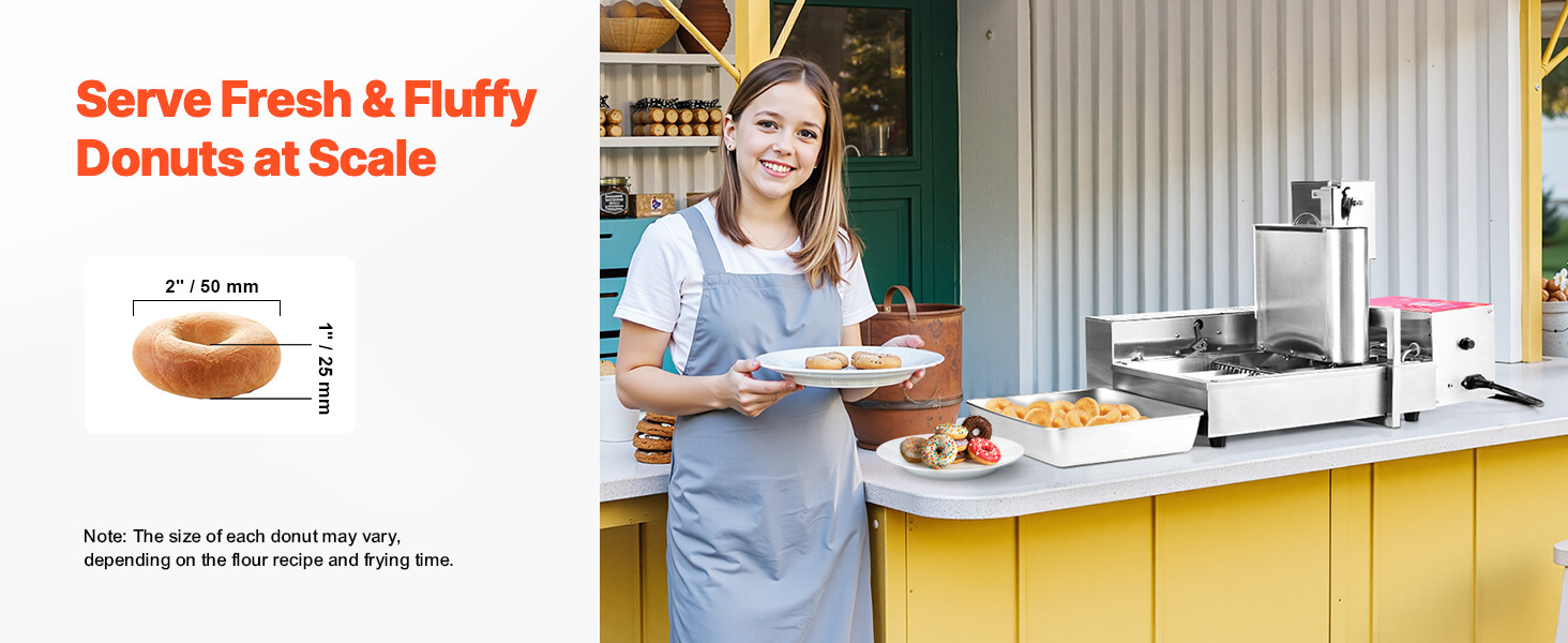 - Classic Ring-Style Donuts: The doughnut maker produces approximately 50 mm ring donuts with 25 mm thickness, ensuring uniform shapes and crispy textures. The size of each donut may vary, depending on the flour recipe and frying time.