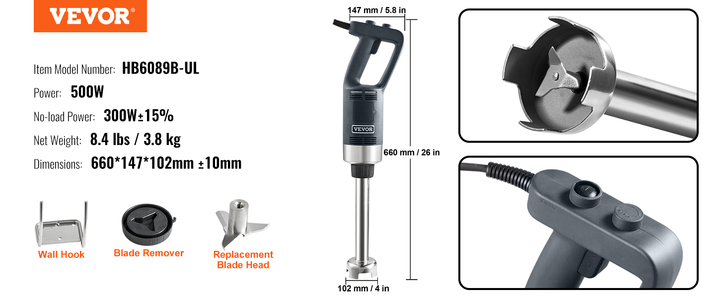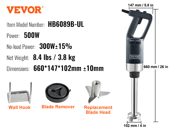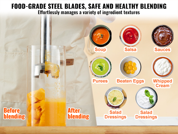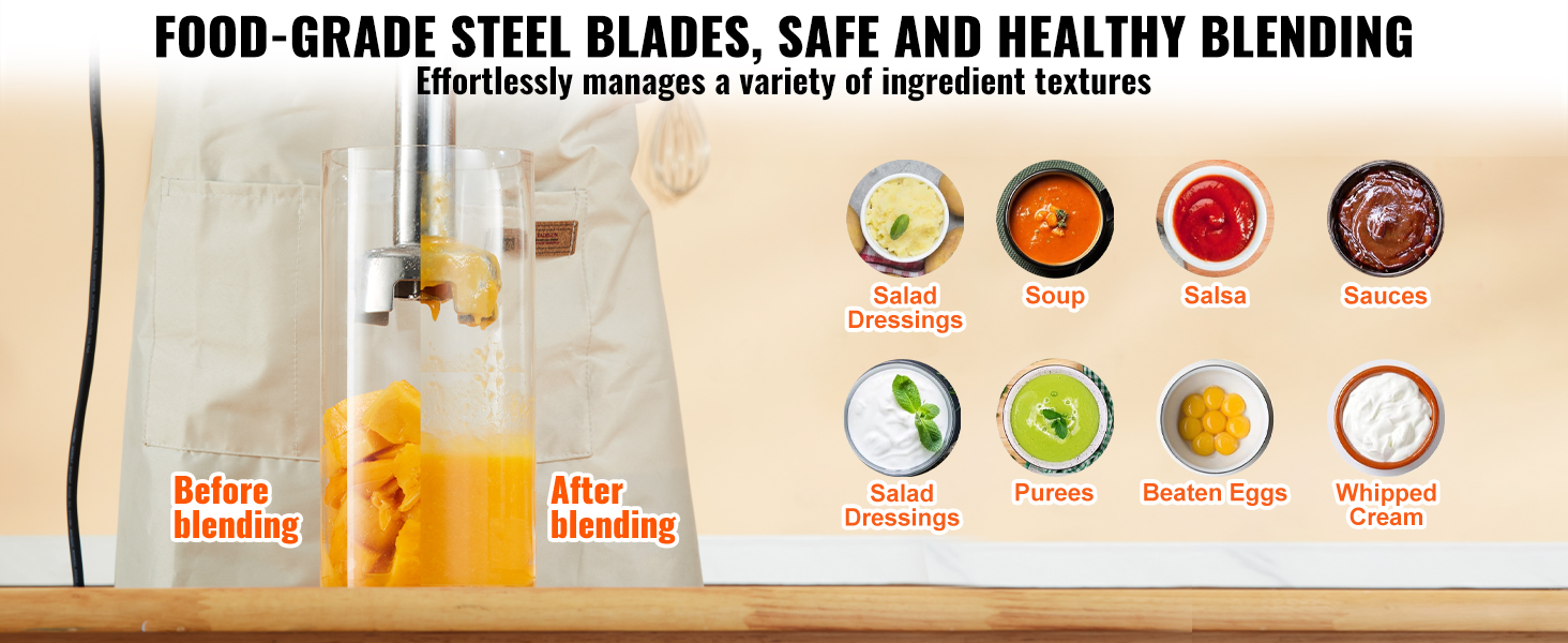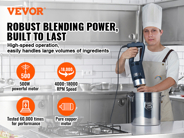 This VEVOR 500W immersion blender is fantastic! The 16-inch shaft makes it perfect for deep pots, and the motor is strong enough to blend soups, sauces, and smoothies effortlessly. It’s sturdy, comfortable to hold, and easy to clean. Works like a professional kitchen tool—highly recommend!