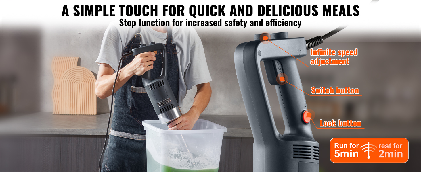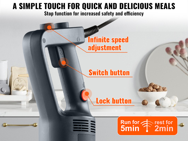 - One-Button Ease of Blending: Our stick blender features a rubberized comfortable grip, ensuring safe and controlled operation. The lock button design allows for prolonged use. Overheating protection ensures the machine cools down after continuous use—operate for 5 minutes and rest for 2 minutes, ensuring safety. Variable speed control provides a liberating blending experience.