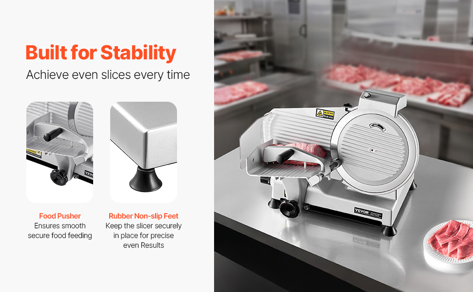 - Stable & Secure: Equipped with a blade shield, food pusher, and non-slip feet, this deli meat slicer ensures steady, smooth slicing for enhanced safety during operation. The automatic food pusher further improves efficiency.