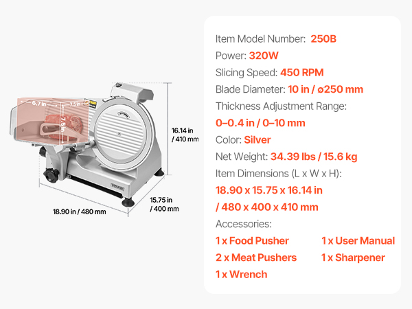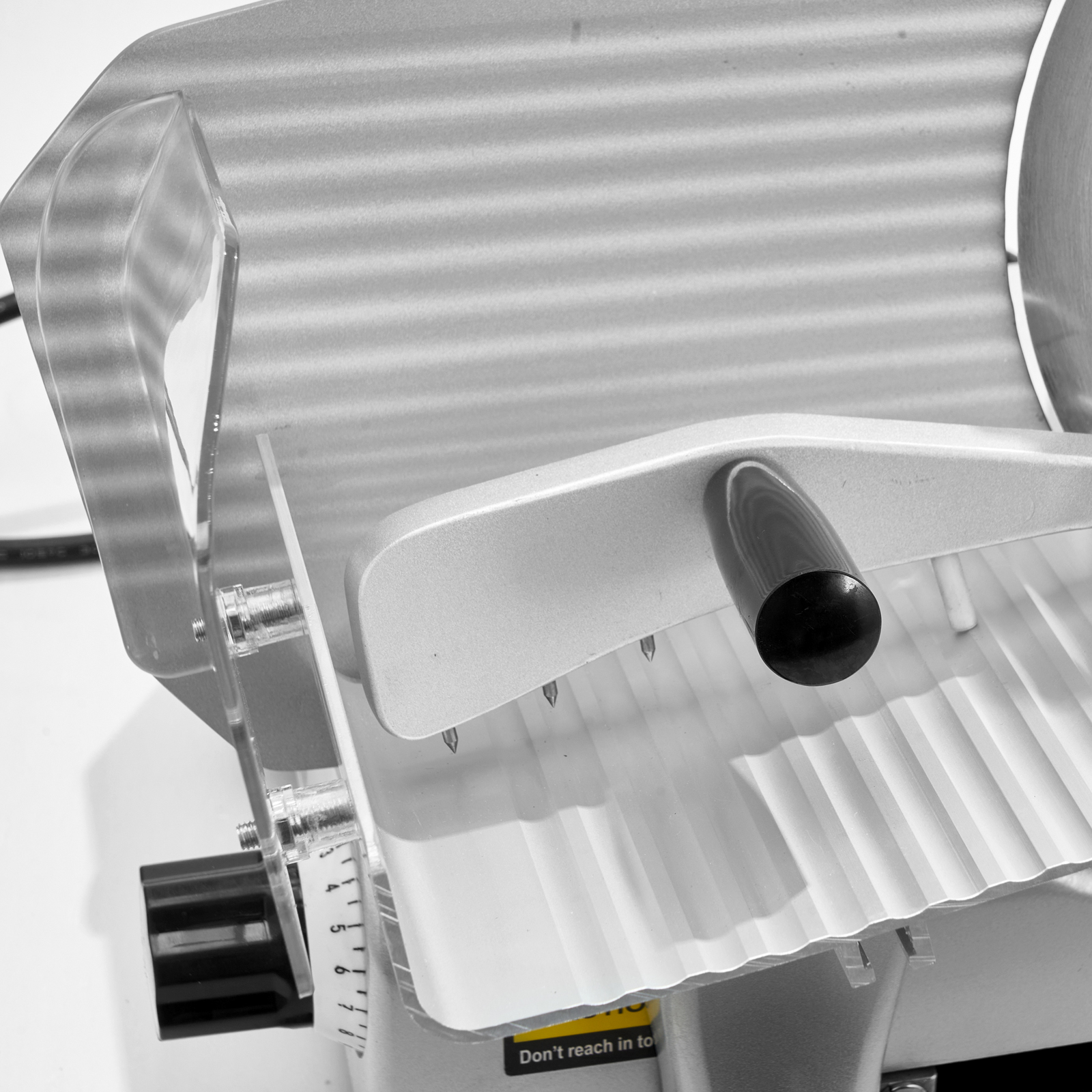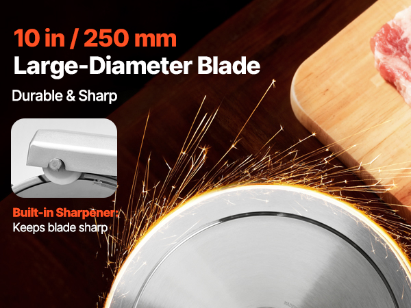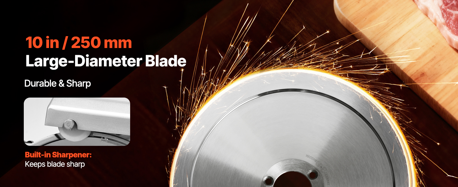 - Durable Construction: This deli slicer features a die-cast aluminum body and a 10 in (250 mm) carbon-manganese steel blade, rust- and corrosion-resistant for long-lasting use. It includes: