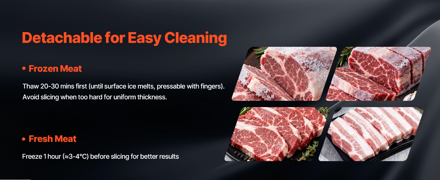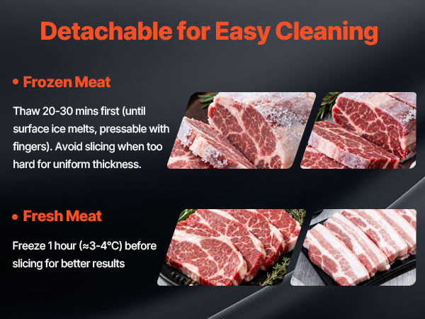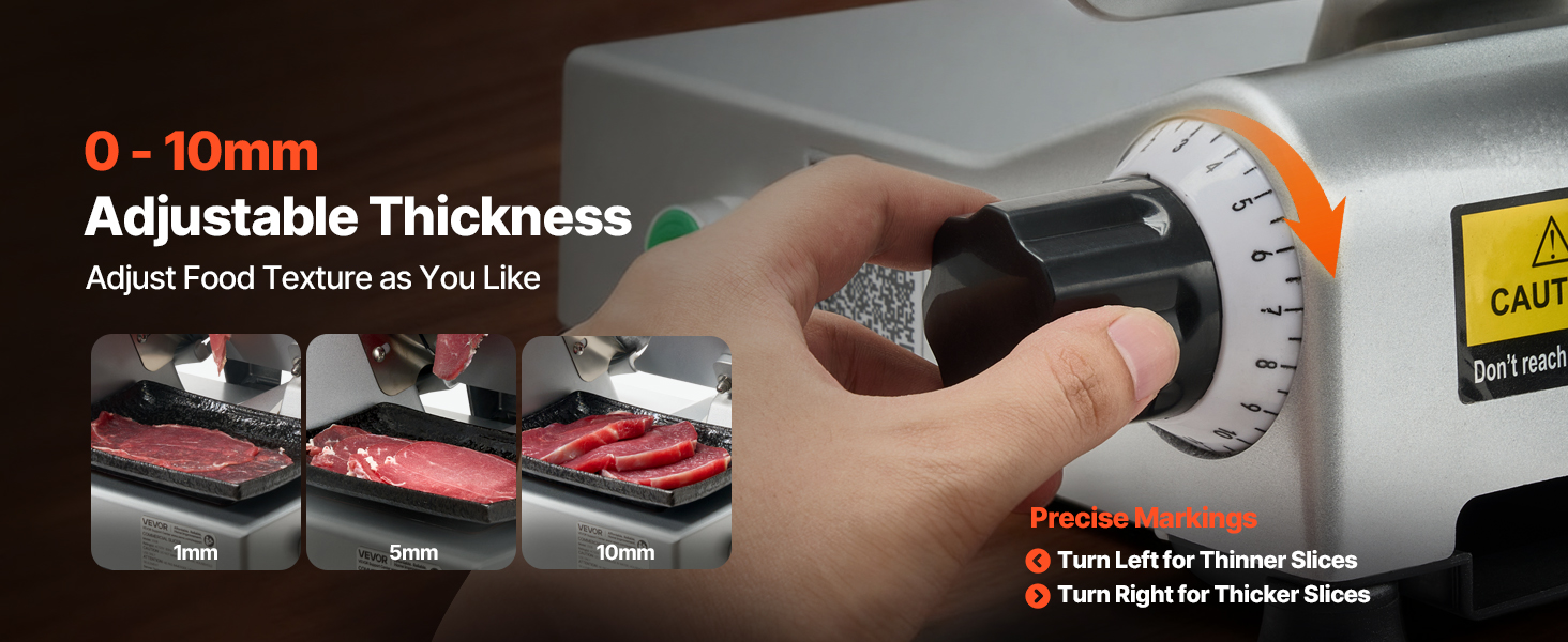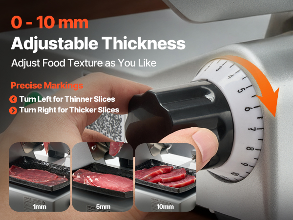 - Precise Thickness Adjustment: This frozen meat slicer features a thickness adjustment knob with a range of 0–10 mm (0–0.4 in), allowing you to easily customize slice thickness. Ideal for making burgers, sandwiches, cold cuts, fruit platters, and more