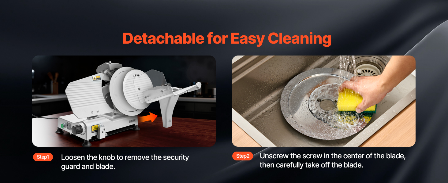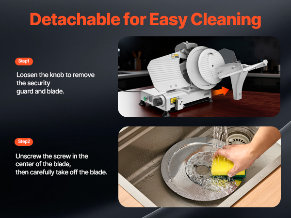 - Easy to Clean: After slicing, the stainless steel food tray can be easily wiped clean with a cloth. The blade, food holder, and food pusher are removable, ensuring thorough cleaning for maintaining hygiene during subsequent slicing operations with the meat slicer machine.