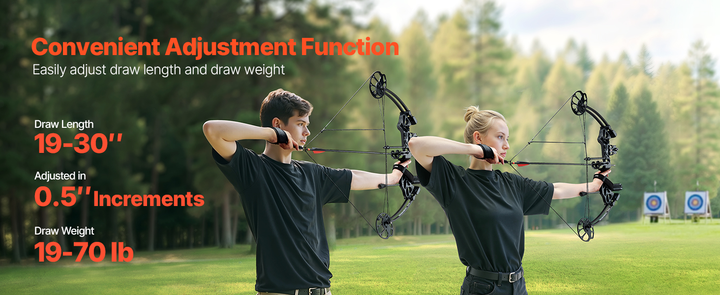 • Convenient Adjustment: The draw length can be adjusted between 19–30 inches in 0.5-inch increments, and the draw weight can easily switch between 19–70 pounds. Both beginners and experienced archers can quickly find the right settings.