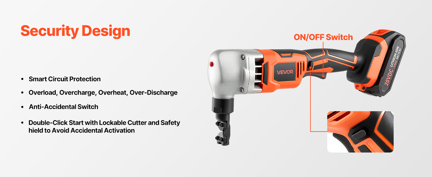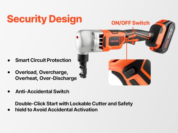 Equipped with overload, overcharge, overheat, and over-discharge protection, this sheet metal nibbler ensures reliable operation. It specially features an anti-accidental switch and a lockable protective guard to avoid risks caused by accidental operation.