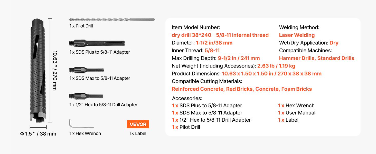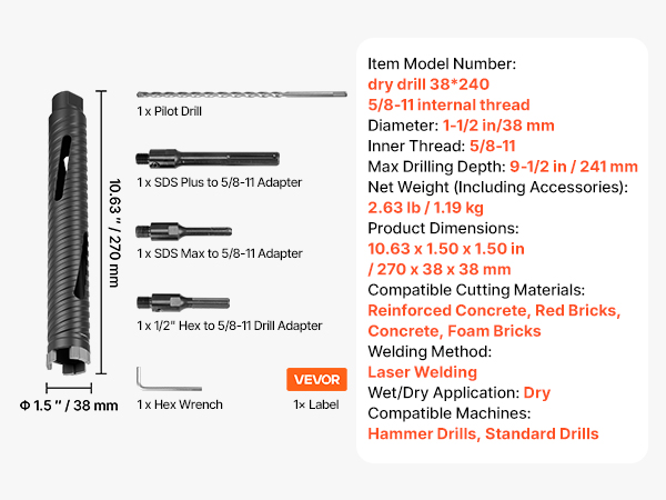 - High Compatibility: This set includes a 1-1/2-inch diameter core drill bit, three adapters, and one pilot drill, making it compatible with most standard drills and hammer drills. Combine versatility and convenience for various tasks.