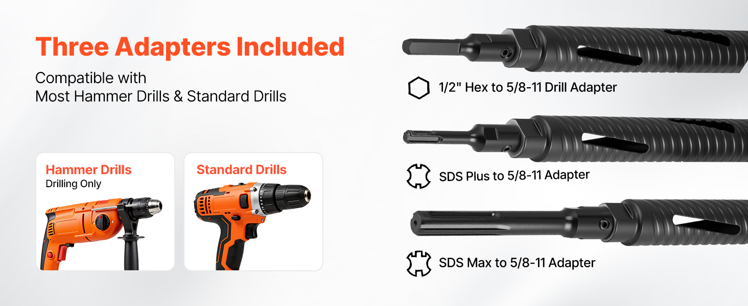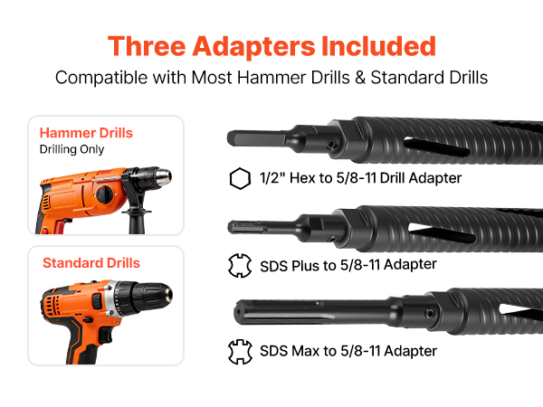 Our diamond dry coring bit includes three adapters for easy compatibility with SDS Plus, SDS Max, and 1/2 in hex drill bits. No need for additional purchases—this set handles all your drilling needs.