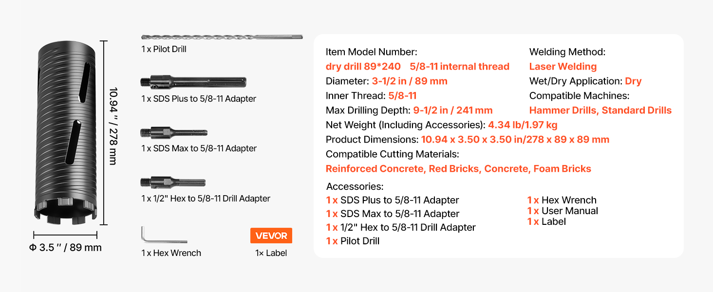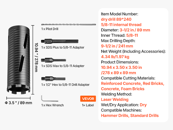 - High Compatibility: This set includes a 3-1/2-inch diameter core drill bit, three adapters, and one pilot drill, making it compatible with most standard drills and hammer drills. Combine versatility and convenience for various tasks.