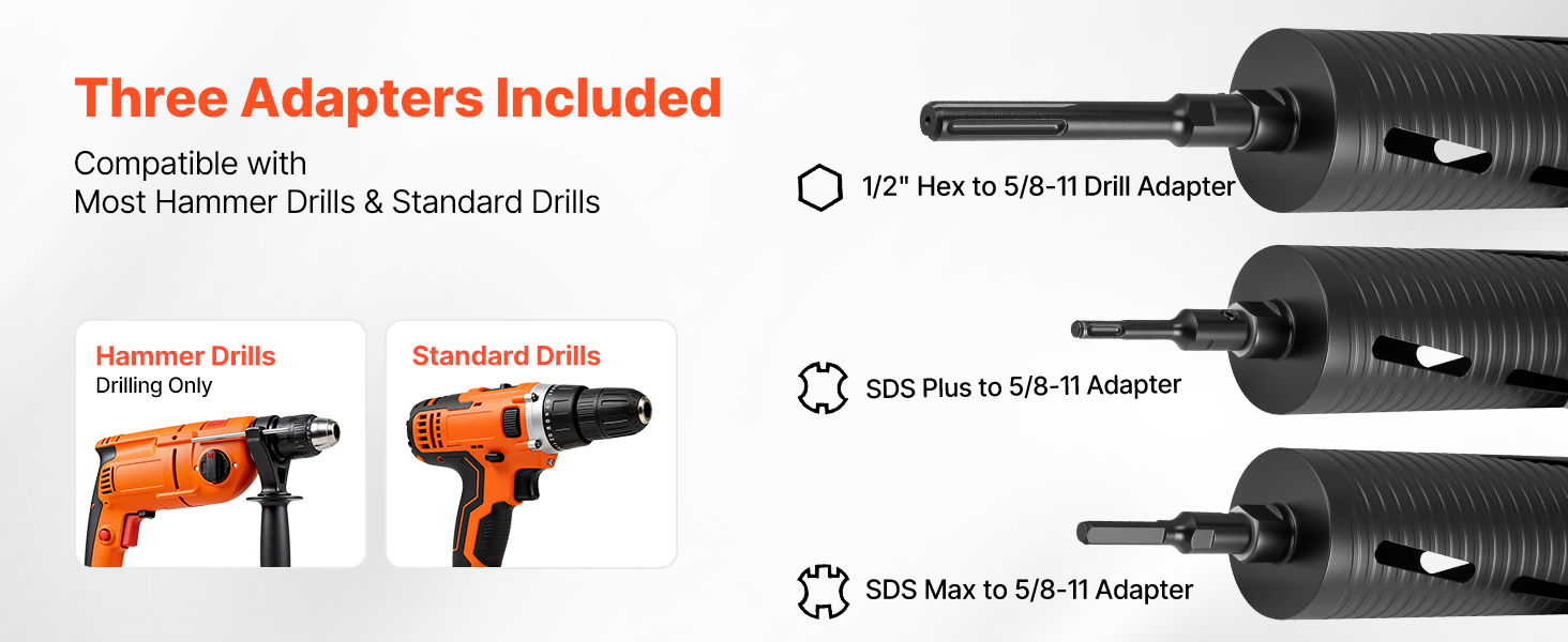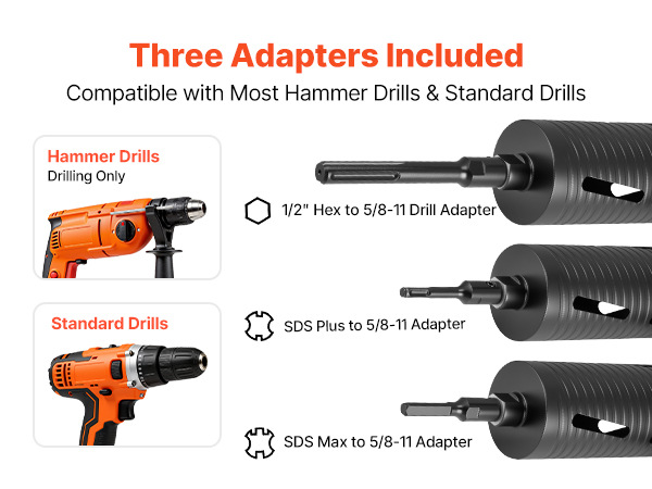 Our diamond dry coring bit includes three adapters for easy compatibility with SDS Plus, SDS Max, and 1/2 in hex drill bits. No need for additional purchases—this set handles all your drilling needs.