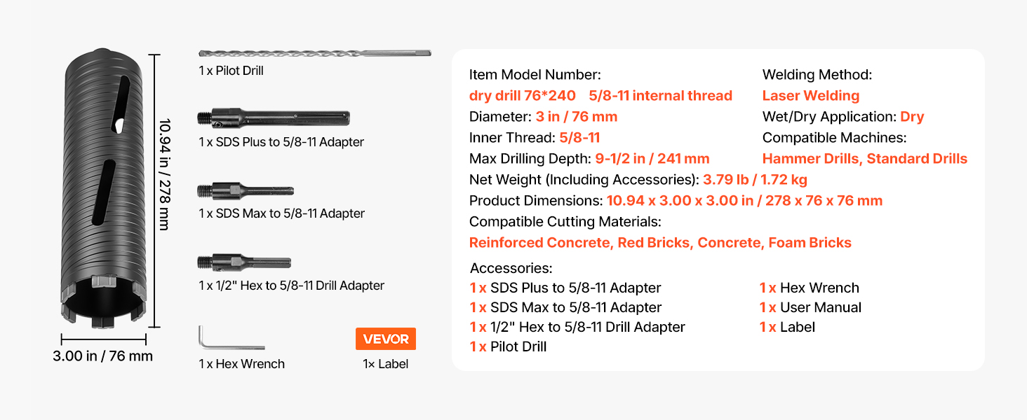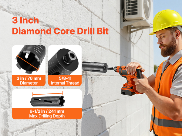 - High Compatibility: This set includes a 3-inch diameter core drill bit, three adapters, and one pilot drill, making it compatible with most standard drills and hammer drills. Combine versatility and convenience for various tasks.