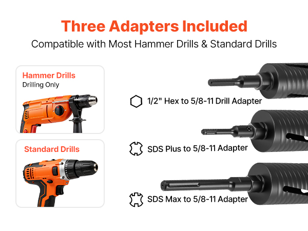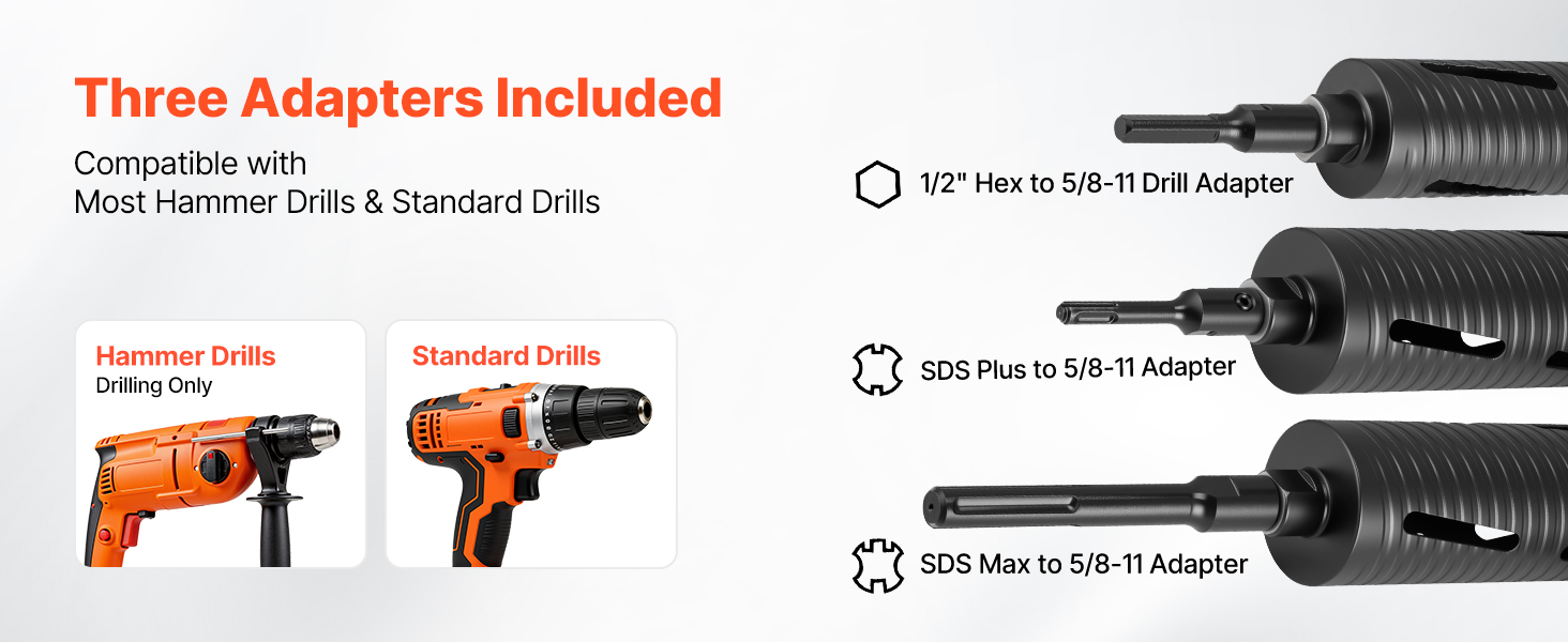 Our diamond dry coring bit includes three adapters for easy compatibility with SDS Plus, SDS Max, and 1/2 in hex drill bits. No need for additional purchases—this set handles all your drilling needs.